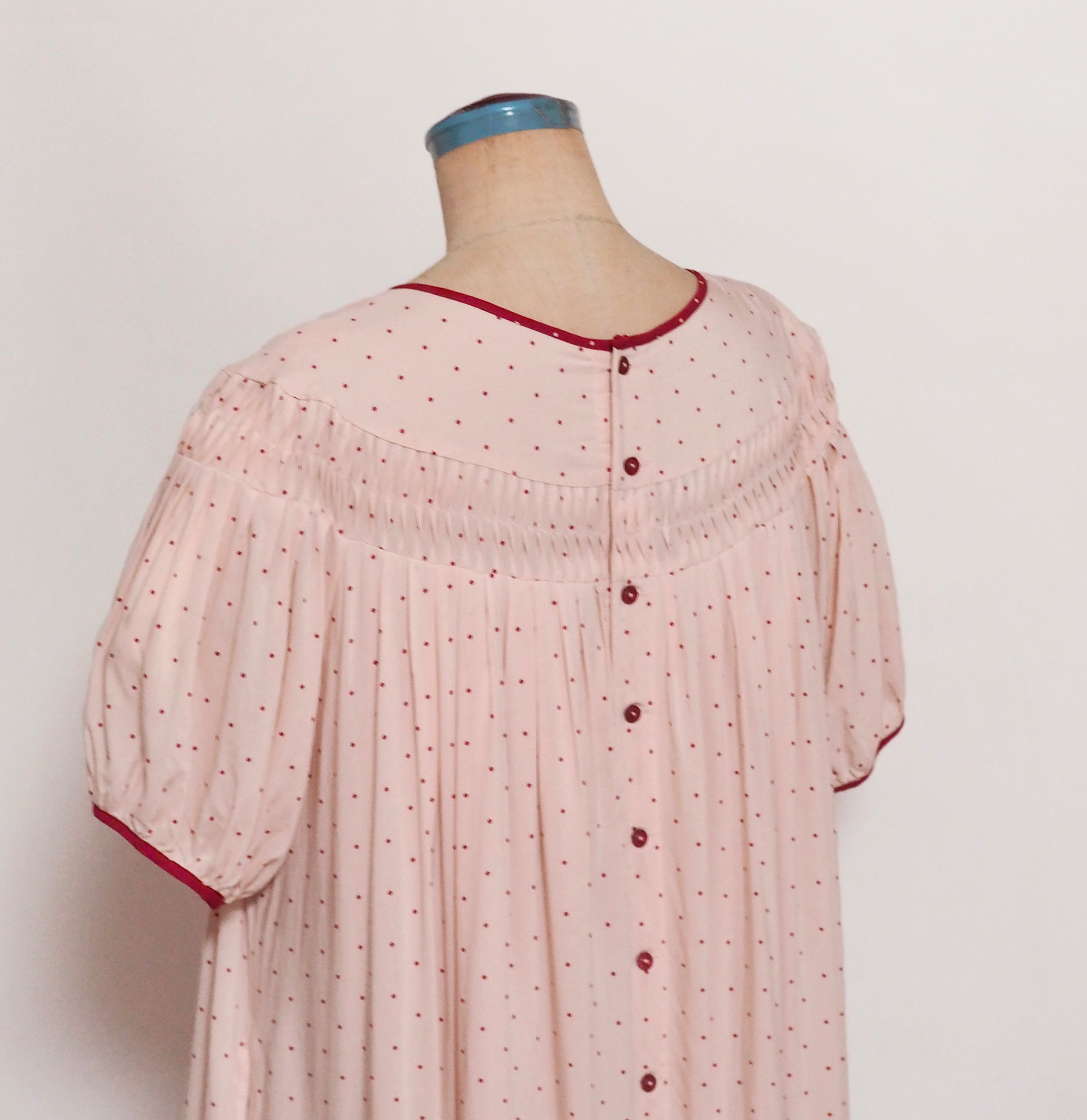 襟ぐりと袖ぐりには反転生地のパイピング。